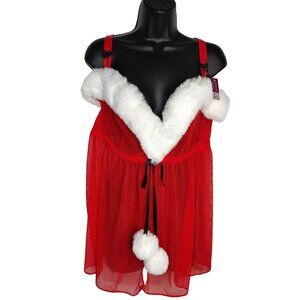 Adore Me Sheer Red Babydoll Lingerie With Faux Fur Trim & Pom Poms Size 40H
