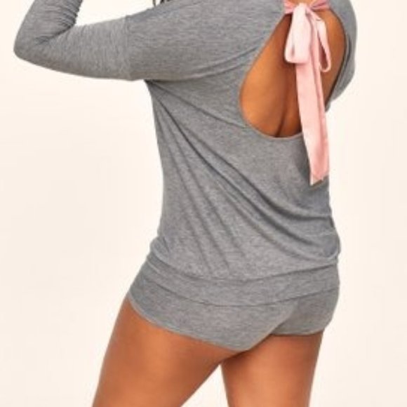 Comfy cozy gray lounge set with a pink tie for added cuteness.