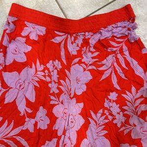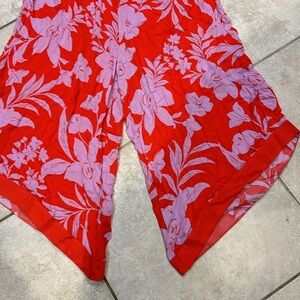 Gently worn Adore Me Vacation Vibes Tropical Floral Gauze Wide Leg Palazzo pants women’s pmts size 2X. 100% rayon, crinkled gauze material, red with light purple tropical floral print, smocked elastic waist, wide leg style, flowy, cropped length, hits mid calf, angled cut with wide hem. Super cute! Perfect for an any tropical vacation. Offers accepted!