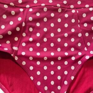 Flirty vintage vibes with these Adore Me high-waisted bikini bottoms! Burgundy with white polka dots, soft polyester fabric, and full coverage fit. Size Medium, gently used and swim-ready.