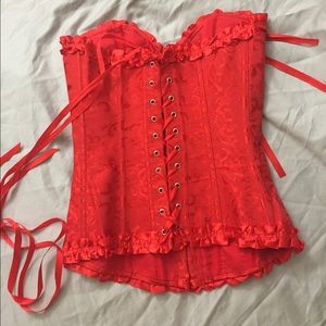 Beautiful red detailed corset from Adore Me - never worn. Perfect condition; no flaws! Would fit around size s, but the back laces up and is adjustable. Would fit anywhere between a-c bra size.
