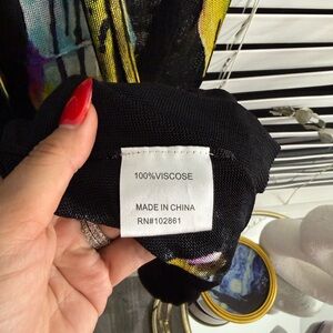 Elegant scarf with a striking wing design. Features black, yellow, blue, and green tones.