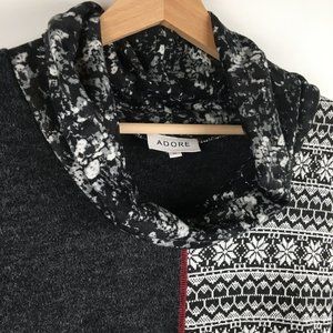 Get cozy and holiday-ready in this funky oversized sweater by the French clothing company, Adore. Contrasting fabric, red stitching and high quality construction with a subtle winter wonderland theme. The flattering tunic fit is perfect over tights or even jeans and the contrasting pattern and cowl neck will look super cute in pictures next to the turkey or holiday tree!
