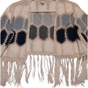 Adore Women's Denim Patchwork Crochet Fringe Cropped Jacket Sz S Boho Festival