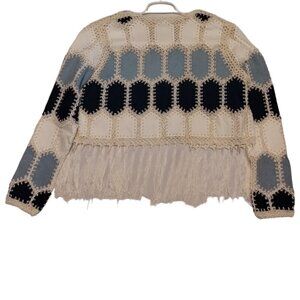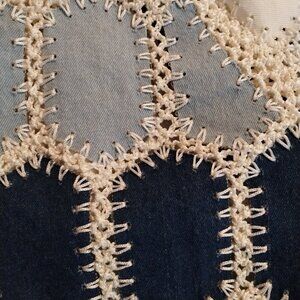 Adore Women's Denim Patchwork Crochet Fringe Cropped Jacket Sz S Whimsical Boho.