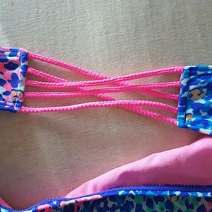 Super cute colorful print swim suit. It's only been worn once, it just doesn't fit me right. The bottoms have 5 Chris crossing things on the sides as shown in the last picture, but one side is missing one of the five, as shown in the second to last picture, although it doesn't affect how they fit at all. Otherwise it's in great condition. The top is a size small and the bottoms are a medium