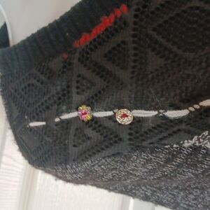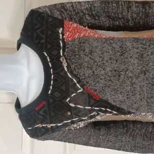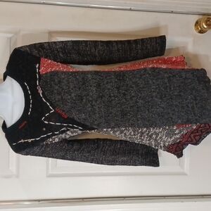 this is a beautiful lightweight knit Patchwork Style Top by Adore. this top is made in a patchwork style of all lightweight materials heather gray arms that are slightly see-through and the top itself has white and black on one end has a black ribbed collar the top chest piece is black with like a holy design the center is gray with a little bit of fuzz to it and the other side is red and cream colored it's really extremely unique has all different little buttons on the front. the bottom is etched in a v-type shape it's definitely great going into spring and it's great going into fall it also has a polyester under line for Comfort to the skin though the sweater is extremely soft it's really different in style very unique looking and I love it and it's got this stitchwork threading of cream red really cute. it's a size small measurements lying flat approximately pit to pit 18" length from top to bottom is 32 in this would look great with a pair of gray leggings red leggings black leggings of course . has stretch to it.. Like brand new! :-)