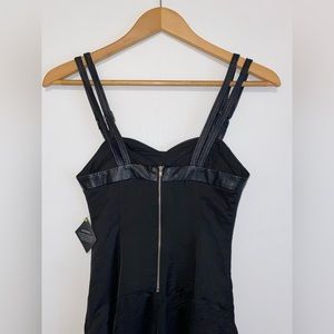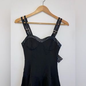 Gorgeous silky black fit and flare dress featuring a faux leather trim at bust and double buckled straps. Fully lined, exposed silver zipper closure at back. Brand new, unworn with tag. In perfect condition. True to size.