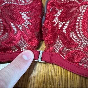 Adored by Adore Me Red Lace Overlay Underwire Bra in Women’s Size 32D. Heavy Padding. Bra has some piling inside the cups, but is otherwise in good used condition with no holes or stains. Please see close-up pictures for condition details.