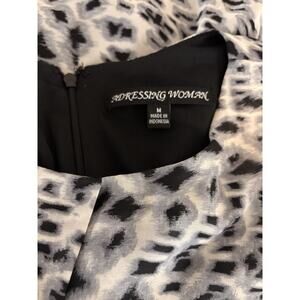 This avant-garde Adressing Woman dress in size M features a scoop neckline, sleeveless design, and knee-length shift silhouette with a layered overlay. The dress is adorned with a multicolor animal print pattern and a zipper closure at the back. Made of 100% polyester fabric, it is lined and wrinkle-resistant, perfect for travel or casual occasions in the summer, fall, or spring. With its whimsical and outdoor-themed design, this dress offers a unique and stylish option for women looking to make a statement with their wardrobe choices.