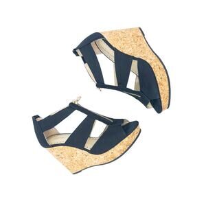 - Color: Black upper with cork wedge heel