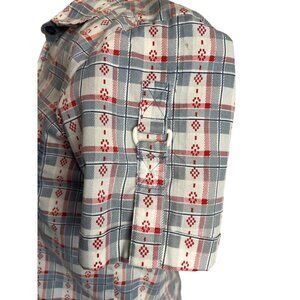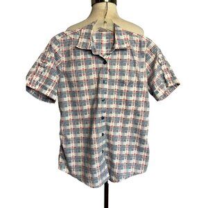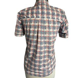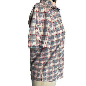 Adrian Delafield Blouse M Button Up short sleeve pocket plaid red whit blue