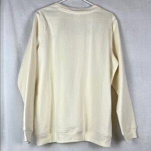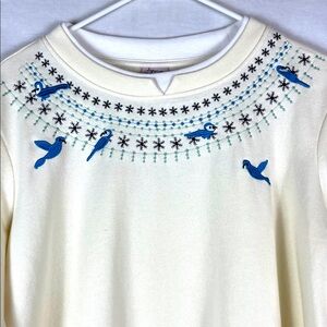 This is a super cozy Adrian Delafield cream sweater with blue birds! Pit to pit is 25 inches and shoulder to bottom hem is 26 inches. It is a size XL. There is a small stain on the sleeve, see last picture.