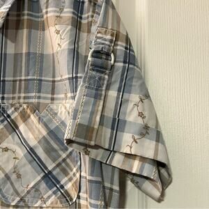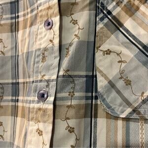 Cute button-down with vine painting/graphic over a pastel blue and tan plaid. Excellent condition.