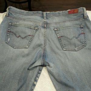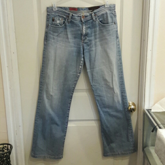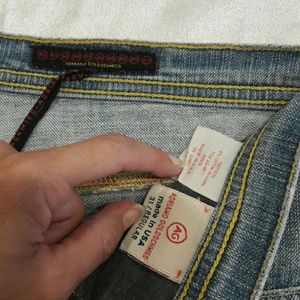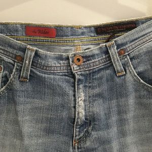 Adrian Goldschmied jeans in 31regular. Inseam is approx 28". Crazy comfortable and stylish. These are the riders and have wide enough legs for boots. There is noticeable wear at the bottom of pant legs and some wear in crotch area. Priced low because of it.