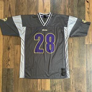 Adrian Peterson Minnesota Vikings #28 NFL Team Apparel men’s jersey, size XL. Features gray body with purple and yellow detailing, embroidered logos, and stitched numbers/letters. Classic Peterson piece from his Vikings era, a must-have for any fan or collector.