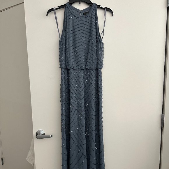 https://www.adriannapapell.com/products/art-deco-beaded-blouson-dress-with-halter-neckline-in-navy-black-19191410 (Please note this is not the same color- I was not able to find the dusty blue color on the website)