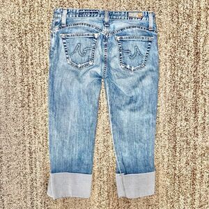 Color is blue denim, rolled capri design