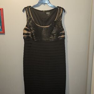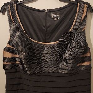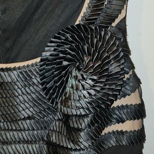 bodice has mesh inset with decorative satin detailing. bottom has horizontal pleated layers hidden zipped back