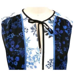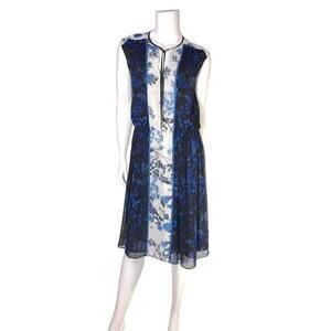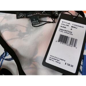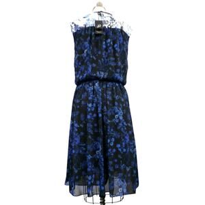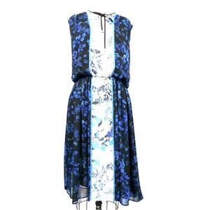 Gorgeous Adrianna Papell cobalt and sapphire blue floral on black and white color block background. Sleeveless blouson bodice with tie at neck. Comfortable and flattering elastic waist and straight/slight a-line falling skirt. Fully lined polyester chiffon. Pull over; fully lined 100% polyester, 41" long from shoulder, NWT msrp $ 120.00