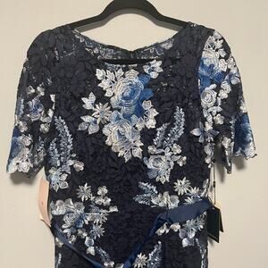 Adrianna Papell Angeline Dress Navy Lace Short Sleeve Long Gown Dress NWT Size 10
