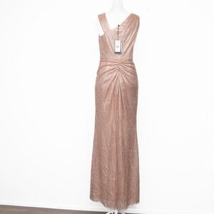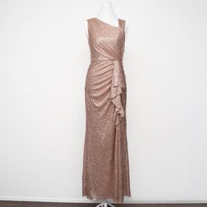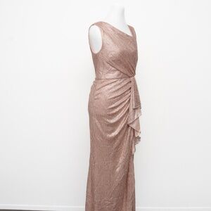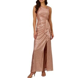 Radiate modern glamour in this Adrianna Papell gown crafted from a shimmering blend of 55% polyester and 45% metallic fibers that beautifully catch the light. Designed with an asymmetrical neckline and draped front that flows into a soft slit at the leg, it offers an effortlessly sophisticated silhouette. Fully lined in smooth polyester for comfort with a side zipper closure, this sleeveless floor-length style is ideal for galas, weddings, or evening celebrations where understated sparkle makes the perfect statement.