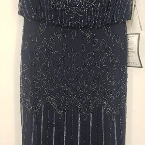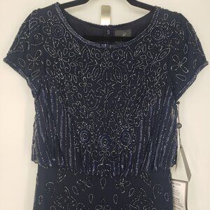 Adrianna Papell Beaded Evening Dress 6 Formal Long Maxi Short Sleeve Navy Blue