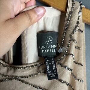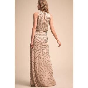 Adrianna Papell Beaded Halter Neck Blouson Maxi Dress in Nude. Size 8. Features halter neck, sleeveless, beaded details throughout, back keyhole with button closure, hidden back zipper closure, lined, and maxi length. 100% Polyester. Excellent condition, no flaws.