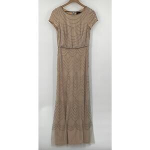 Adrianna Papell Beaded Blouson Gown Art Deco Cap Sleeve Light Nude Silver