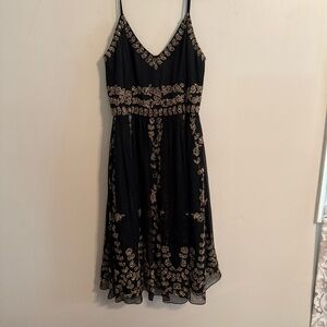 This stunning dress features intricate gold embroidery on a classic black background, perfect for any special occasion. The elegant design and delicate details make it a must-have addition to your wardrobe. EUC-no signs of wear of missing beads. This dress is the perfect evening dress and so elegant. The beadwork is amazing. It is a spaghetti strap and zip closure. Please see photos for measurements. Size 14 evening essentials line by Adrianna Papell. The dress is a bit on the heavy side