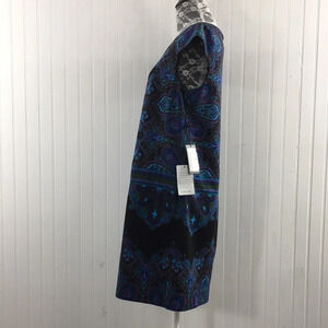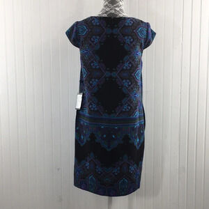 Adrianna Papell Black Blue Batik Print Crepe Shift Dress Womens 6 Cap Sleeve. Above the knee length. Short Sleeve. 100% Polyester. New with tags!