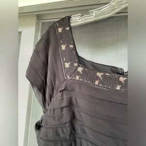 Style tags: square neck, ruffle hemline, pleat, pleated, black and nude tan, lace accent, cocktail, little black dress, fancy dinner, opera, graduation, date night, theater, funeral, wedding, special occasion, classic, stylish