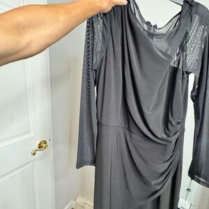 Adrianna Papell dress, black maxi dress, long sleeve dress, mesh sleeve dress, evening gown, formal dress, special occasion dress, party dress, sheer sleeve dress, cocktail dress, ruched dress, draped dress, black jersey dress, classic dress