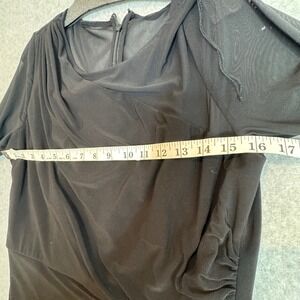 New with tags Adrianna Papell black evening jumpsuit featuring a unique draped overlay that gives the look of an elegant gown with the comfort of pants. Crafted with sheer mesh long sleeves, a soft stretch fabric, and flattering side ruching for a sophisticated silhouette. Hidden back zipper closure. Bust measures approx. 17" across, inseam approx. 29". Versatile style perfect for formal events, galas, or cocktail parties. Please note: there is a small loose stitch at the neckline seam—minor and not noticeable when worn. Style combines the drama of a dress with the ease of trousers for a modern, chic look.