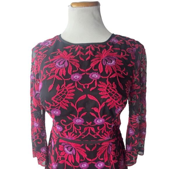 Adrianna Papell Black Embroidered Red Purple Flowers Mesh Sheath Dress 6P