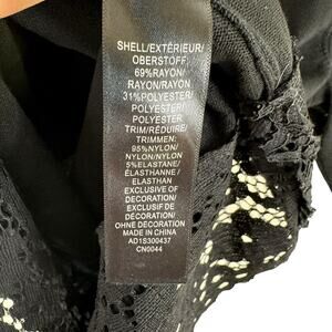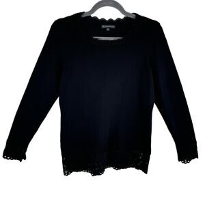 Excellent preowned condition. Black long sleeve tight knit lightweight pullover sweater. Lace trim around neck, cuffs, & bottom hem. Shell is rayon/polyester, lace is nylon/elastane material. Approx. measurements: Shoulder to hem 26", pit to pit 19", sleeve from neck to sleeve hem 27". Size S.