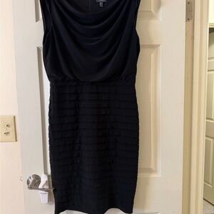 Chic black midi dress with elegant draped neckline. Perfect for formal events.