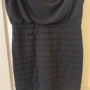 Chic black midi dress with elegant draped neckline. Perfect for formal events.