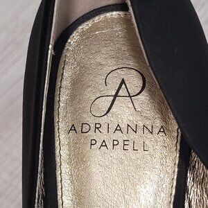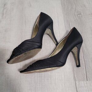 These heels are very comfortable! Size 9 with a 3 1/2 heel height. They are a classic peep toe heel featuring pleated satin and a gorgeous gold inside and sparkly inside heel. The bottoms of the shoes are slightly worn but I have only worn them to one wedding.