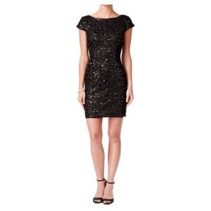 Adrianna Papell Black Sequined Cocktail Dress Size 10P Short Sleeve Mini Sheath