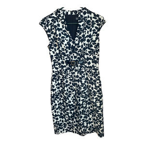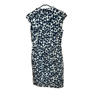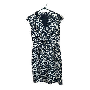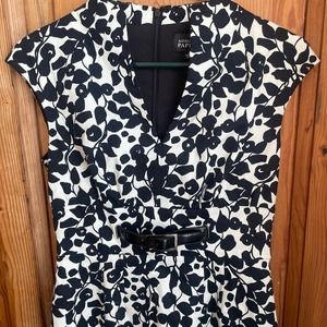 Black and white sheath pencil dress in a black and white floral pattern. Crepe textured material. Split v neck. Hidden waist belt that peeks out right at the center. Functional. Cap sleeves. Lined. Excellent Condition