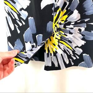 Excellent used condition! Black, gray and bright yellow floral dress. Ruched shoulders in a sleeveless sheath style. Below the knee length. V-neck Surplice yoke. Twist side knot. Small back slit for comfortable mobility. Jersey knit and fully lined.