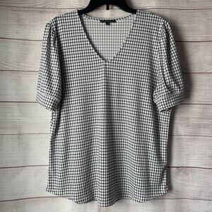 White and black graph check blouse by Adrianna Papell. This top has a v-neckline and puff sleeves. There is a slight stretch to the material. It is pre-owned and in great condition.