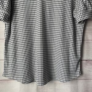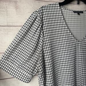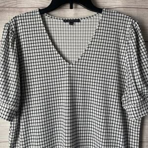 Adrianna Papell Black and White Check Blouse Puff Sleeves V Neckline Size Large