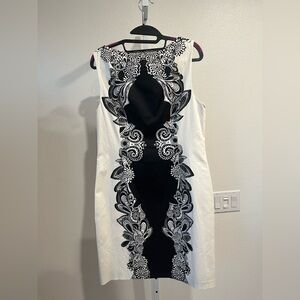 Chic black and white midi dress with intricate floral patterns. Perfect for elegant occasions.
