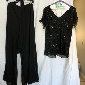 Adrianna Papell, Two piece set Black, size 12 sequinned top with shear flutter cap sleeves. Pants "Cache" brand, size large elastic waist with sash, very flowy. Worn once.