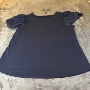Keywords: Adrianna Papell, Plus size top, Flutter sleeve, Clip dot, Blue blouse, Women's top, 3X, Round neck, Elegant top, Dressy top, Party top, Career wear, Business casual, Blouse