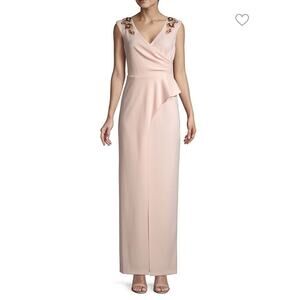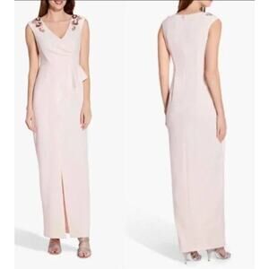 Adrianna Papell Blush Draped Long Dress. Floral Beaded & Rhinestone shoulder details.
