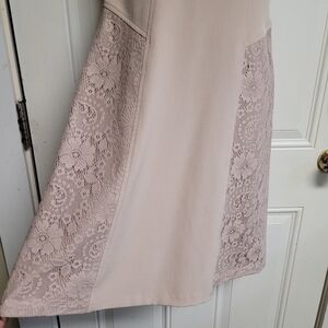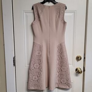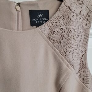Adrianna Papell tan or nude dress with floral lace overlay detailing on the shoulders and on the sides.