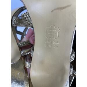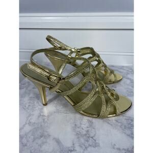 Keywords: Adrianna Papell, cage heels, rope sandals, gold heels, open toe, strappy heels, stiletto sandals, ankle strap, size 10M, designer heels, cocktail shoes, party shoes